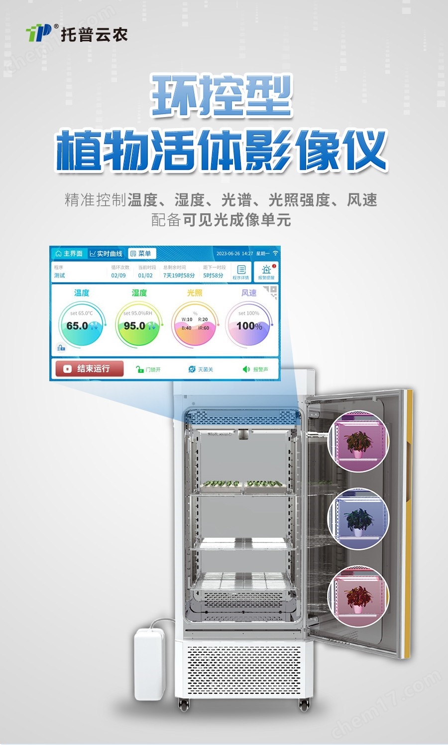 当前位置:首页 > 产品中心 > 智能人工环境工程设备 > 环控型植物活体影像分析仪 > TP-R420D-VB/TP-R1000D-VB环控型植物活体影像分析仪